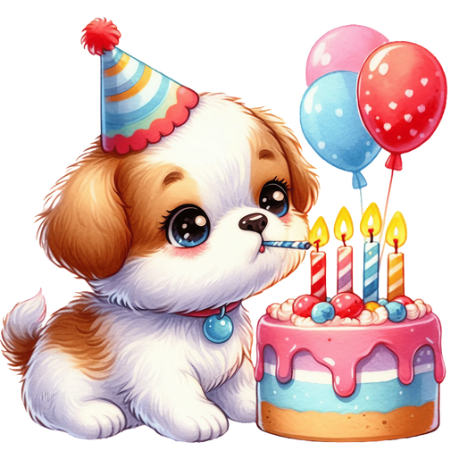 A cute, fluffy dog in a party hat happily sits beside a colorful birthday cake adorned with candles and balloons.DTF Transfers