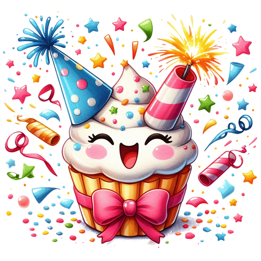 A cheerful cupcake with a big smile, festive party hats, and colorful decorations, perfect for celebrations and joyful moments!DTF Transfers