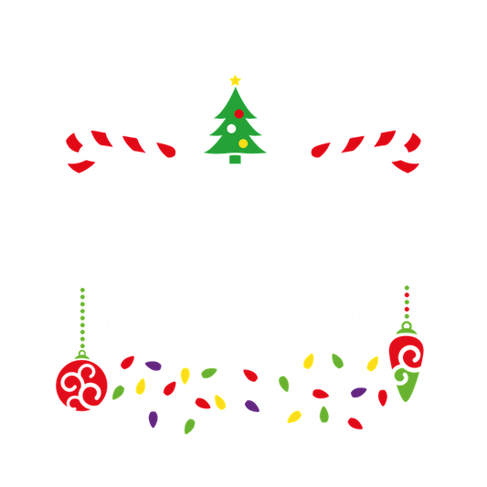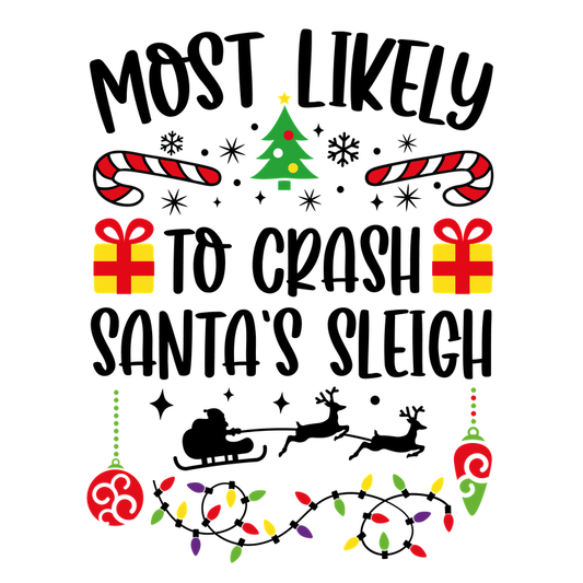 Celebrate the holiday spirit with this fun design featuring the phrase "Most Likely to Crash the Sleigh," adorned with festive decorations!DTF Transfers heat press transfers heat press transfers