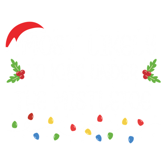A festive design featuring the phrase "Most Likely to Kiss Under the Mistletoe," adorned with holly, snowflakes, and colorful lights.DTF Transfersdtf regular iron dtf prints