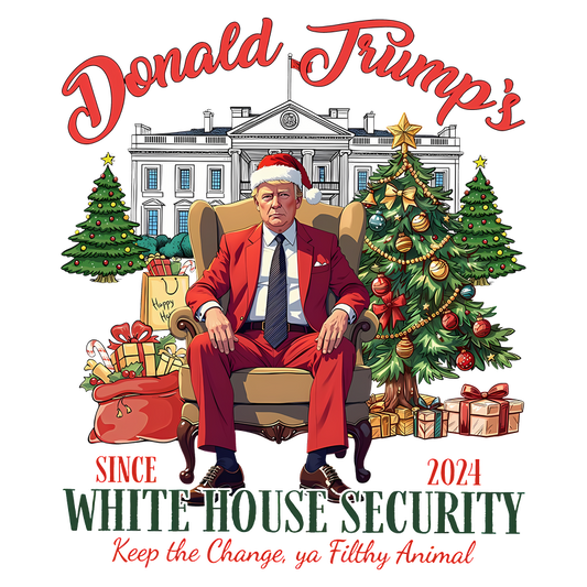 A festive design featuring Trump in a Santa hat and red suit seated in front of the White House, surrounded by Christmas decorations.DTF Transfersdtf regular iron heat press transfers
