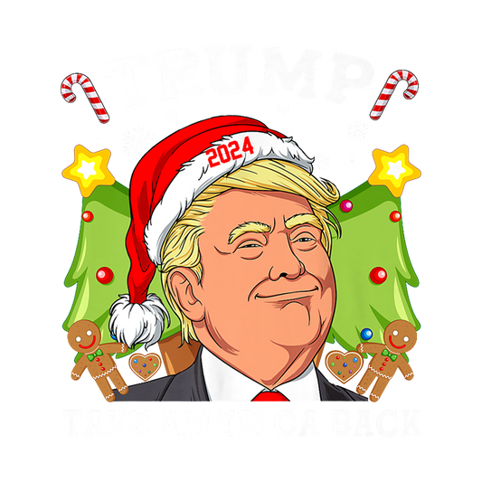 A festive graphic featuring a character in a Santa hat, surrounded by Christmas trees and gingerbread cookies, with "Take America Back" text.DTF Transfers heat press transfers dtf transfers