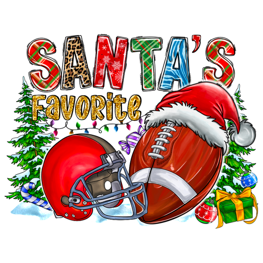 Festive and fun, this design features a football and helmet with "Santa's Favorite," perfect for holiday sports enthusiasts!DTF Transfersdtf regular iron