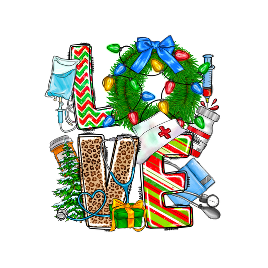 Celebrate the season with this vibrant "LOVE" design, featuring festive elements like a wreath, medical items, and colorful decorations.DTF Transfers heat press transfers