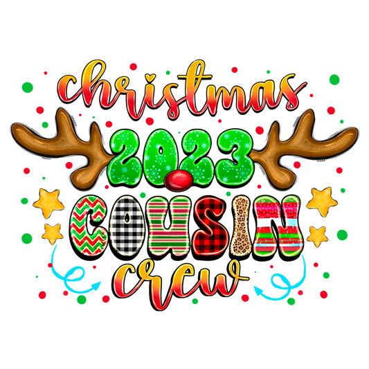 Festive "Christmas 2023 Cousin Crew" design featuring playful colors, reindeer antlers, and fun patterns, perfect for holiday gatherings!DTF Transfers heat press transfers