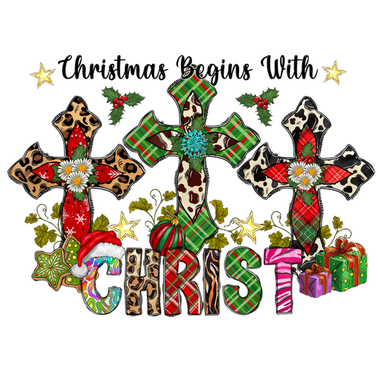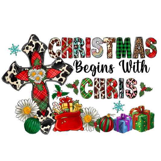 Colorful and festive "CHRISTMAS" design featuring a plaid cross, vibrant gifts, and charming holiday accents, perfect for seasonal decor!DTF Transfers dtf prints