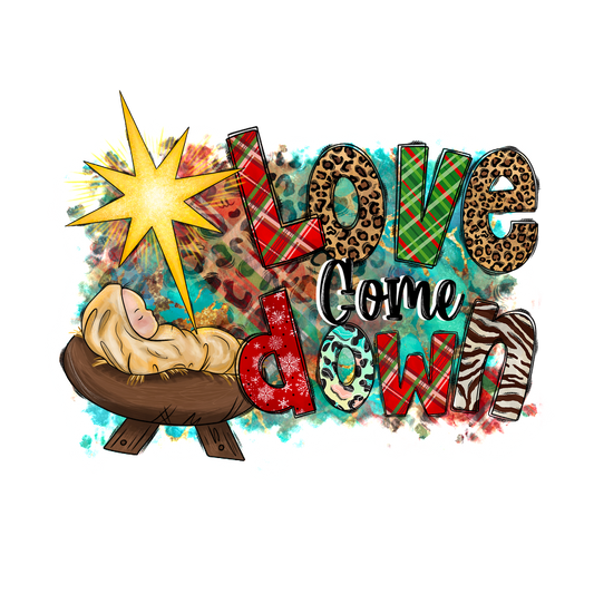 A festive illustration featuring a nativity scene with a newborn in a manger, accented by vibrant, patterned text declaring "Love Come Down."DTF Transfers dtf transfers
