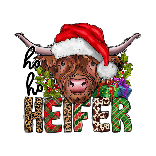 A fun and festive design featuring a holiday-themed cow with the playful phrase "ho ho HEIFER" surrounded by Christmas gifts and decorations.DTF Transfers heat press transfers