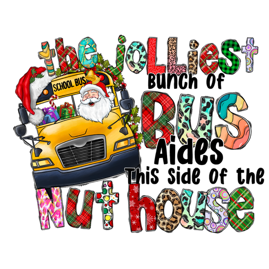 A festive design featuring a cheerful school bus with Santa, celebrating "The Jolliest Bunch of Bus Aides This Side of the Nuthouse."DTF Transfers dtf transfers