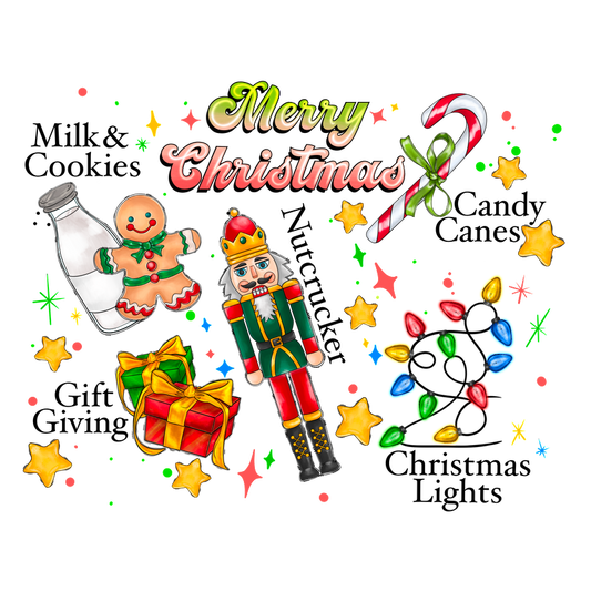 Celebrate the holiday spirit with festive icons, including a nutcracker, gingerbread man, milk, candy cane, and colorful decorations!DTF Transfers heat press transfers