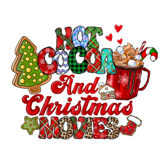 Cozy up with hot cocoa and festive Christmas movies, featuring playful holiday-themed designs and cheerful colors!DTF Transfers heat press transfers
