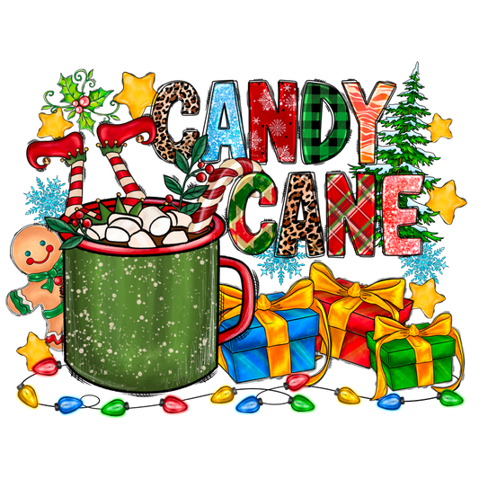A festive holiday scene featuring a green mug filled with marshmallows, candy canes, gingerbread cookies, and colorful presents.DTF Transfers heat press transfers