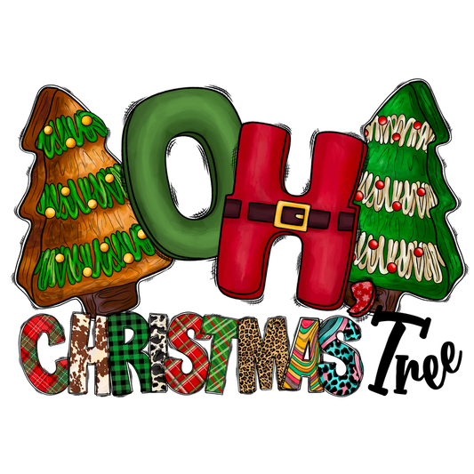 Cheerful Christmas-themed design featuring playful letters and decorated trees, embodying festive spirit and joyful holiday vibes.DTF Transfers dtf prints