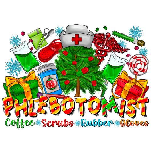 A festive and colorful design featuring a Christmas tree, gifts, and various medical items, celebrating the phlebotomist profession.DTF Transfers heat press transfers