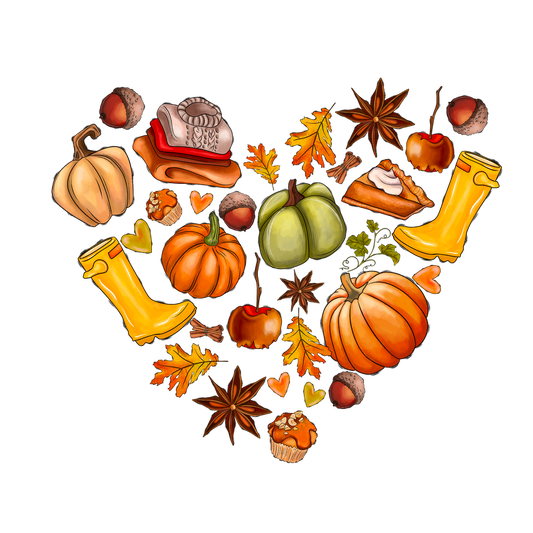 A charming autumn-themed illustration featuring pumpkins, leaves, acorns, yellow rain boots, and a slice of pumpkin pie, all in a heart shape.DTF Transfers heat press transfers