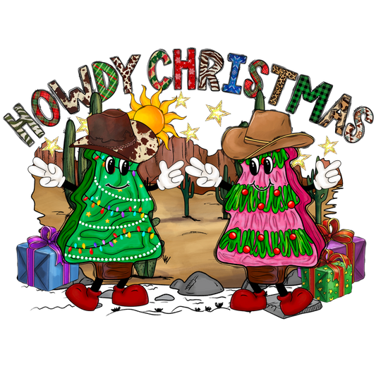Celebrate the holiday spirit with these festive, cowboy-themed Christmas trees, adorned with lights and surrounded by presents!DTF Transfersdtf regular iron