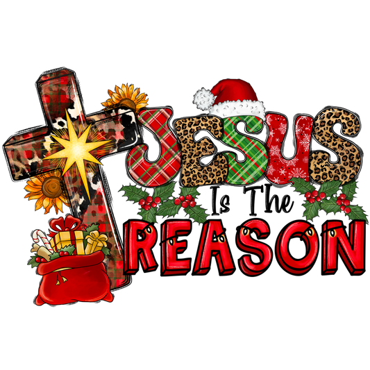 A festive graphic featuring a cross and playful lettering that says "Jesus is the Reason," adorned with Christmas elements.DTF Transfersdtf regular iron