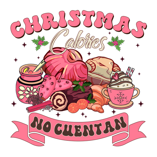 Festive illustration featuring a variety of sweet treats and holiday beverages, with the playful phrase "Christmas calories don't count."DTF Transfers heat press transfers