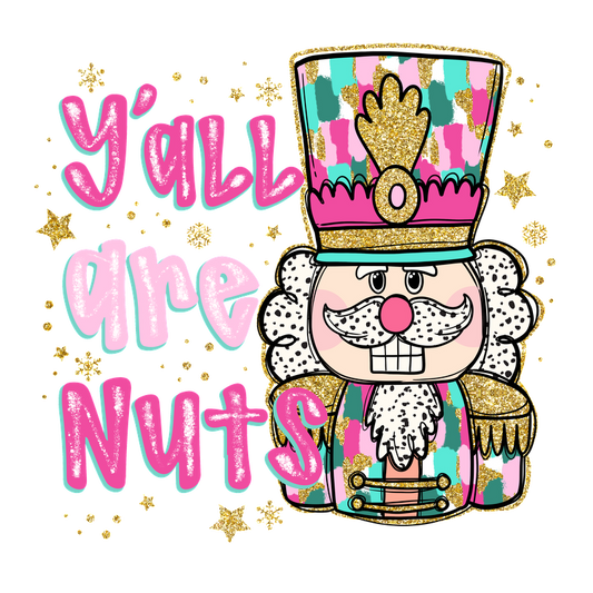 A colorful nutcracker character with a playful "Y'all are Nuts" phrase, surrounded by sparkling stars for a festive vibe.DTF Transfers