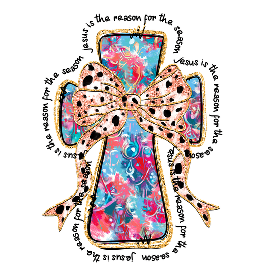 A vibrant gift box illustration adorned with a playful polka-dot bow, featuring a colorful abstract design.DTF Transfers heat press transfers
