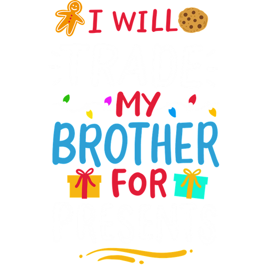 A playful and colorful design stating "I will trade my brother for presents," complete with festive graphics like cookies and gift boxes.DTF Transfersdtf regular iron heat press transfers