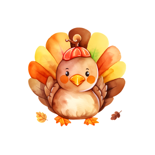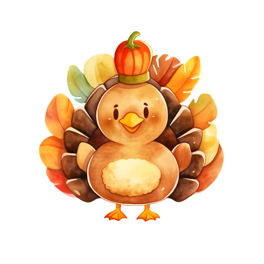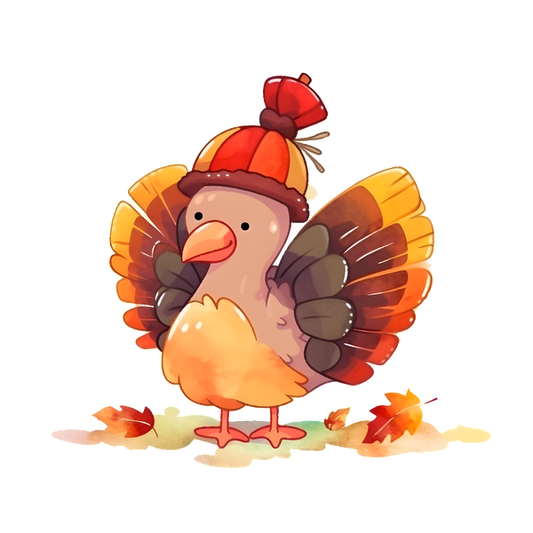 Un simpático personaje de dibujos animados de pavo con plumas de colores y una expresión encantadora, que lleva un pequeño sombrero de calabaza.