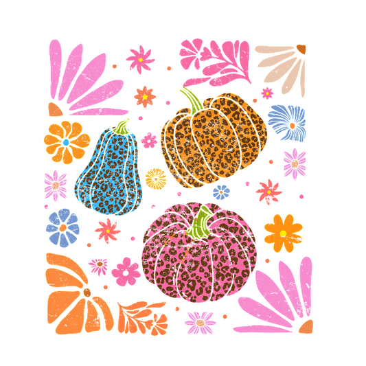 Un diseño floral vibrante con calabazas, peras y flores coloridas, todas adornadas con divertidos estampados de leopardo.