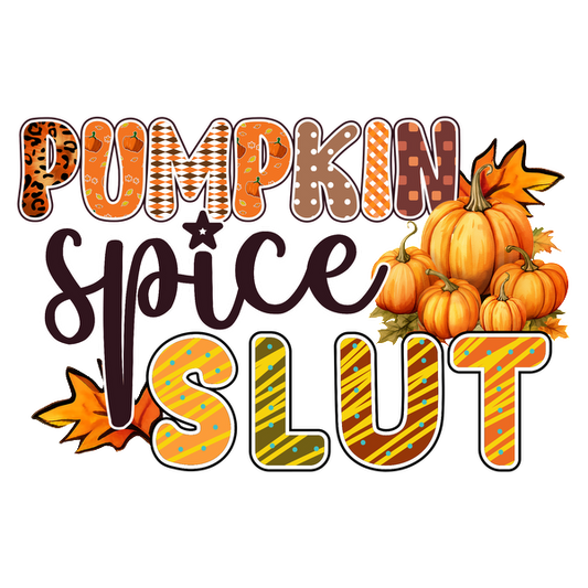 Un diseño divertido con temática otoñal que presenta la frase "Pumpkin Spice Slut" con letras coloridas y calabazas y hojas decorativas.