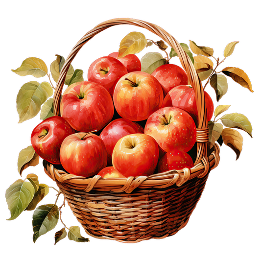 Una canasta bellamente tejida rebosante de manzanas rojas vibrantes y acentuada con hojas verdes frescas.