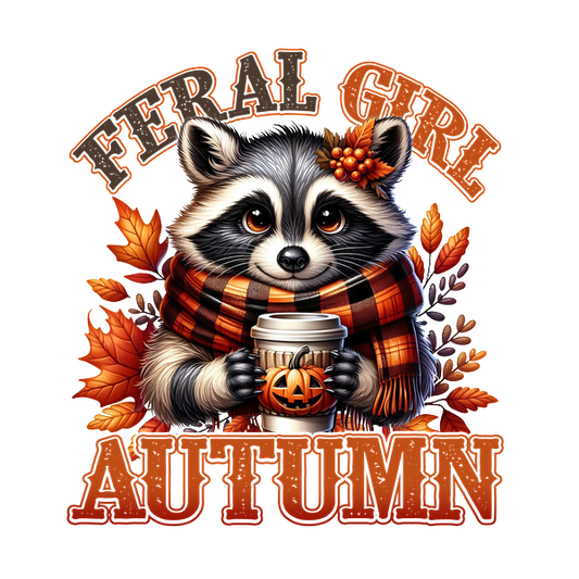 Un lindo mapache vestido con una bufanda sostiene una taza de café de calabaza entre hojas de otoño, con el texto "Feral Girl Autumn".