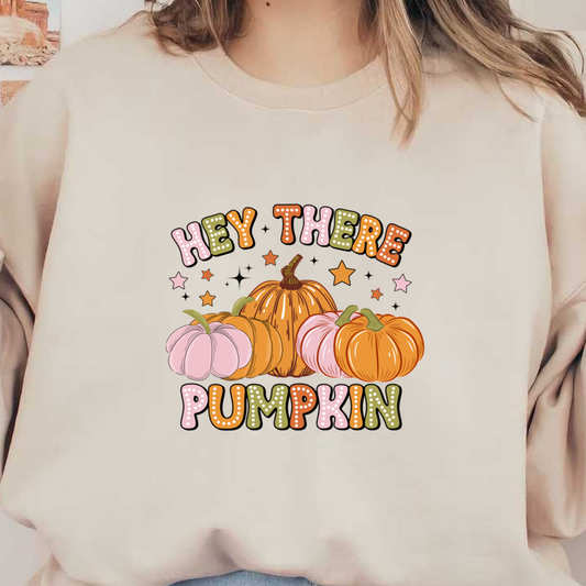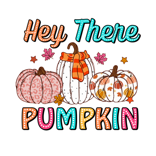 Un diseño alegre que presenta calabazas coloridas con la divertida frase "Hey There Pumpkin" y estrellas alrededor.