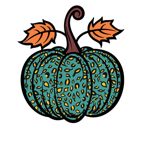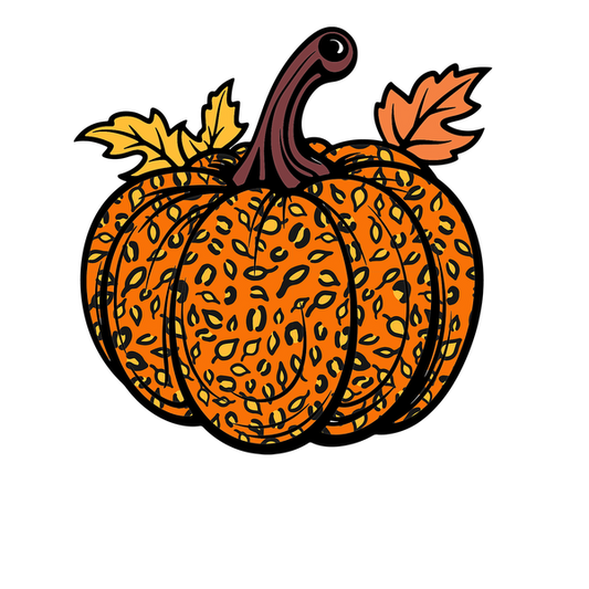 Una calabaza de color naranja vibrante adornada con un elegante lazo con estampado de leopardo, perfecta para decoraciones de otoño.