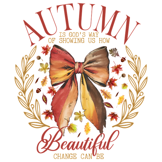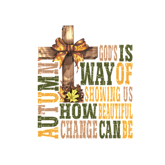 Un gráfico decorativo con temática otoñal que presenta una cruz, un lazo y un texto sobre la belleza del cambio y refleja temas espirituales.