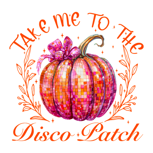 Una calabaza vibrante, estilo mosaico, adornada con un lazo y la divertida frase "Llévame a Disco Patch".