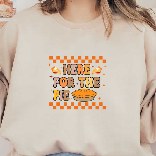 Un diseño alegre que presenta la frase "Here for the Pie" con una ilustración de pastel y elementos decorativos, ¡perfecto para los amantes del pastel!