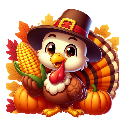 Un alegre pavo de dibujos animados con un sombrero de peregrino, sosteniendo maíz, rodeado de calabazas y hojas de otoño. ¡Perfecto para el Día de Acción de Gracias!