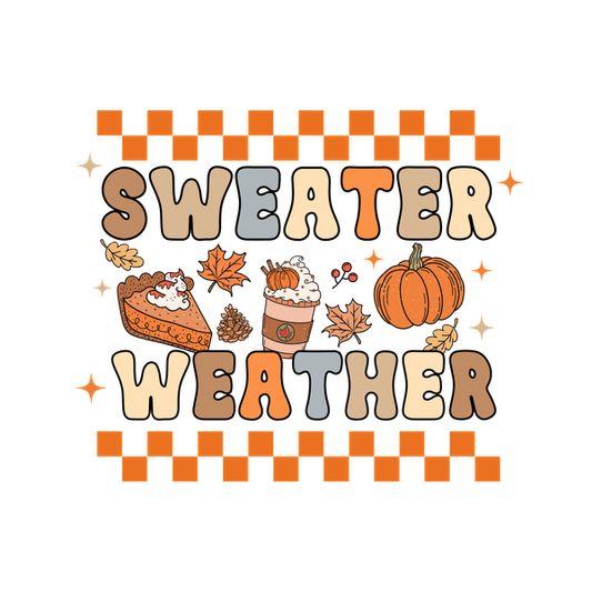 Este acogedor gráfico celebra el "clima de suéter" con elementos otoñales como calabazas, pasteles y hojas en colores cálidos.