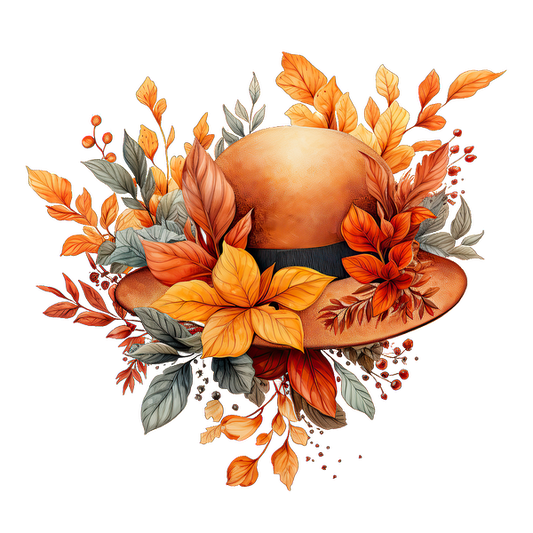 Un encantador sombrero naranja adornado con vibrantes hojas y flores otoñales, perfecto para celebrar la temporada de otoño.