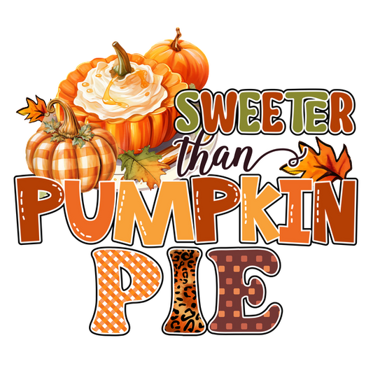 Celebre la dulzura del otoño con este vibrante gráfico "Más dulce que el pastel de calabaza" que presenta coloridas calabazas y hojas otoñales.