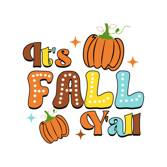 Celebre la temporada con este vibrante diseño "It's Fall Y'all" que incluye divertidas calabazas y letras coloridas.