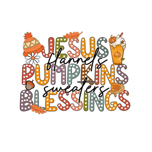 Precio habitual A partir de £0.75 GBPPrecio habitualPrecio unitario / por£2.40 GBPPrecio de oferta A partir de £0.75 GBPUn gráfico vibrante con temática otoñal que presenta las palabras "Jesús, franelas, calabazas, suéteres, bendiciones", adornado con elementos festivos.