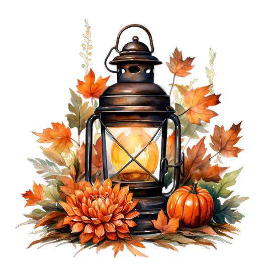 Una encantadora linterna vintage rodeada de vibrantes hojas otoñales, una calabaza festiva y una flor grande, perfecta para la decoración de otoño.