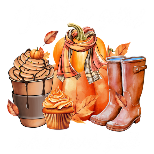 Un encantador diseño con temática de otoño que incluye una calabaza, botas cómodas, postres y una bufanda acogedora, que celebra las vibraciones del otoño.