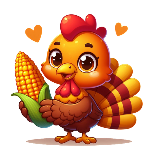 Un alegre pavo de estilo de dibujos animados sostiene una mazorca de maíz brillante, rodeada de corazones divertidos, que muestra un divertido tema de cosecha.