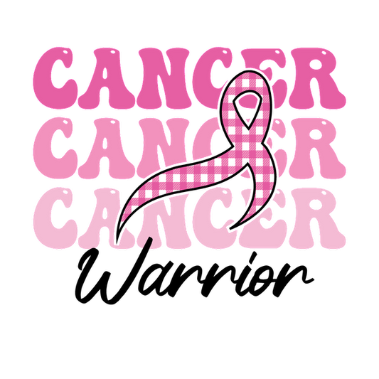 Texto en negrita de color rosa que presenta la palabra "CÁNCER" repetidamente, acentuado con una cinta de concientización a cuadros de color rosa, que simboliza el apoyo a la concientización sobre el cáncer.
