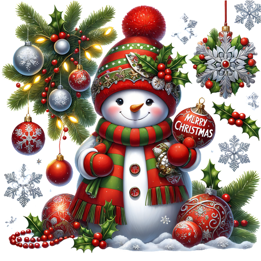 A cheerful snowman wearing a festive striped scarf and hat stands amidst Christmas decorations, holding a "Merry Christmas" ornament.DTF Transfers dtf transfers