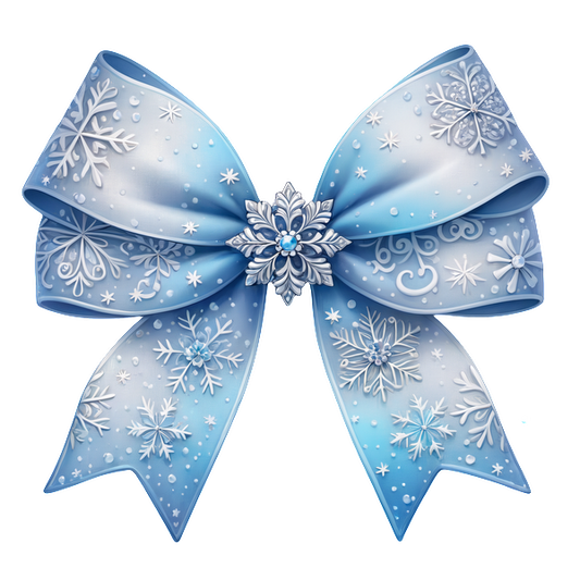 Un hermoso lazo azul adornado con patrones de copos de nieve, con delicados detalles y un copo de nieve decorativo central.