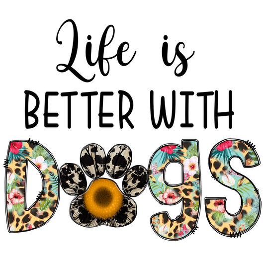 Letras "Dogs" coloridas y extravagantes con patrones florales, estampado de leopardo y un alegre diseño de margaritas en el centro. Transferencias DTF