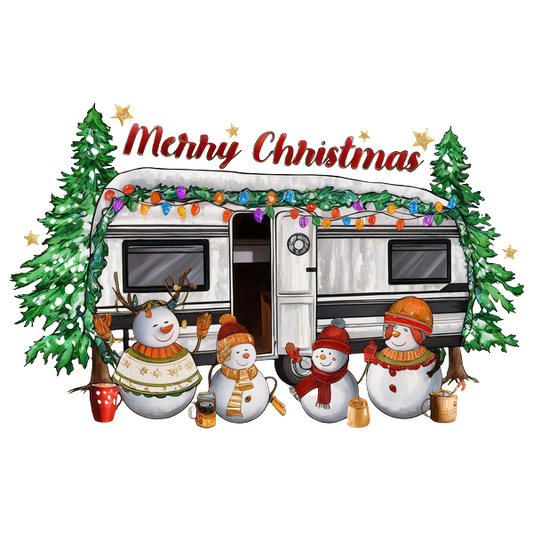 Una escena festiva con una caravana decorada, muñecos de nieve alegres y árboles de Navidad, celebrando el espíritu navideño con alegría.