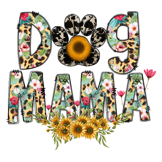 A vibrant and playful "Dog Mama" design featuring colorful floral and animal print letters adorned with sunflowers and greenery.DTF Transfers dtf transfers